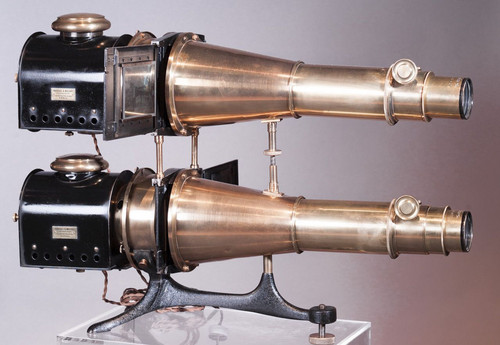Deux salles de projection étaient installées dans les jardins de Boulogne du temps d’Albert Kahn ; une dédiée à la projection de l’autochrome, l’autre pour le film. Aujourd’hui, plusieurs lanternes de projection figurent dans les collections du musée. L’appareil de projection dit « caméléon » est développé en 1922 par les constructeurs Radiguet et Massiot. Ce projecteur faisait partie des collections avant 1939, date à laquelle est inventorié le matériel lors de la prise en charge du site par le département de la Seine. Cet appareil de projection, en superposant deux semblables, permet de réaliser des « vues fondantes », c’est-à-dire en fondu enchaîné.